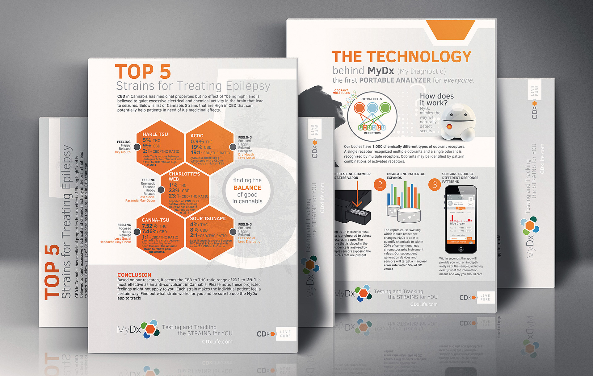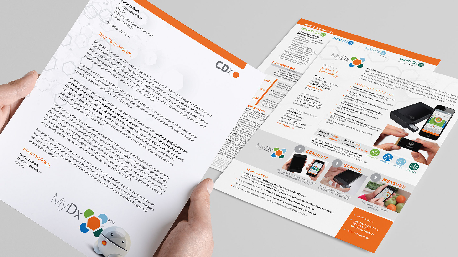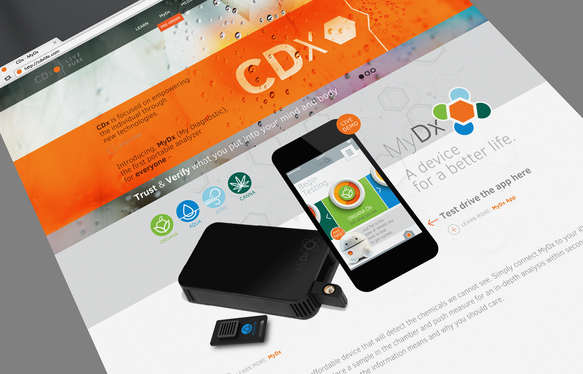 After a successful round of early fundraising and development, CDx was positioned to bring a new personal electronic device to market called MyDx. This personal analyzer empowers the user to live a healthier life by revealing the purity of what you eat, drink & inhale in real time. With an aggressive production schedule, CDx partnered with Good Project to develop their branding, app integration and user interface, packaging design and all supporting marketing materials. We developed the tools needed to successfully launch the product and make their IPO transition.