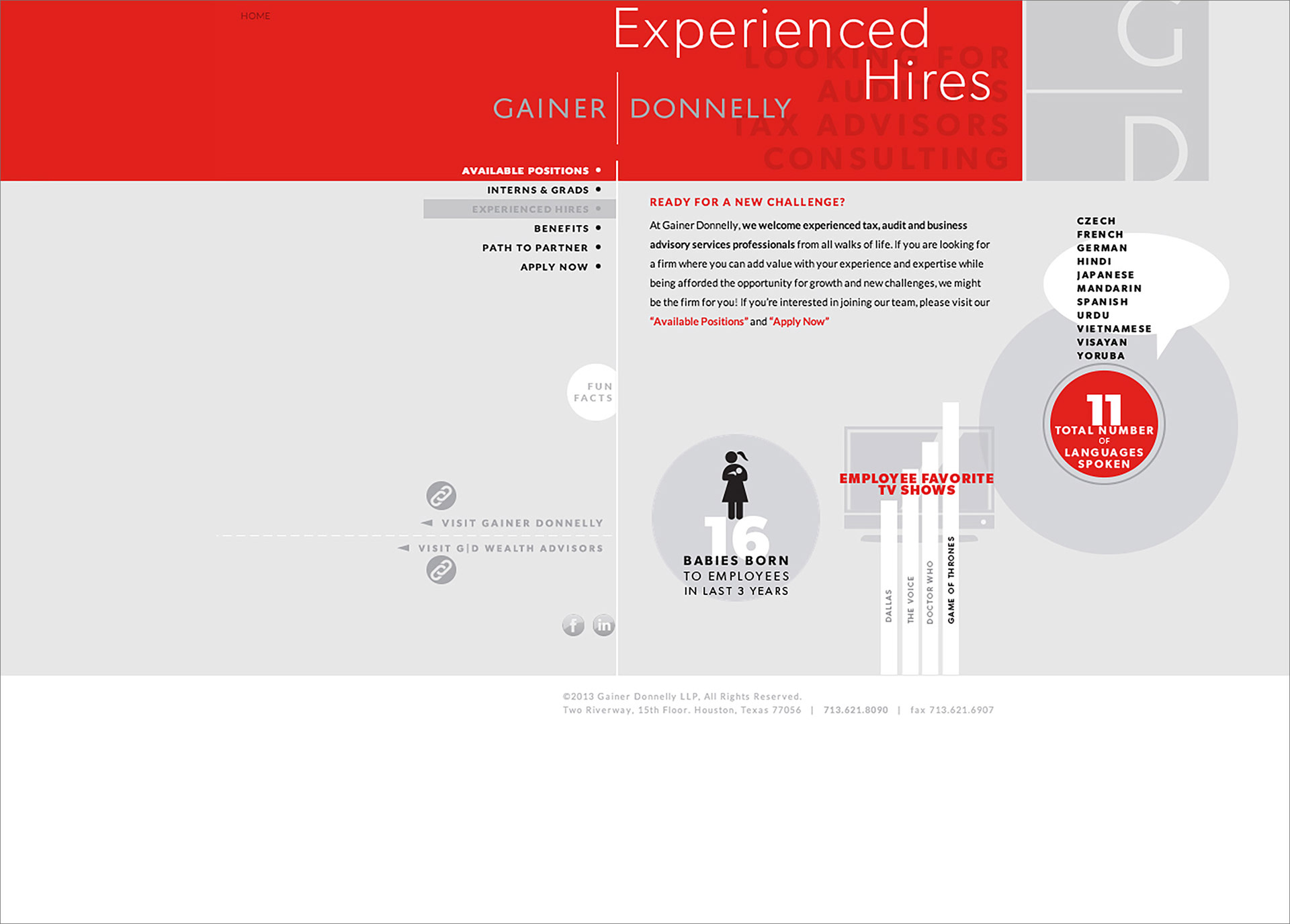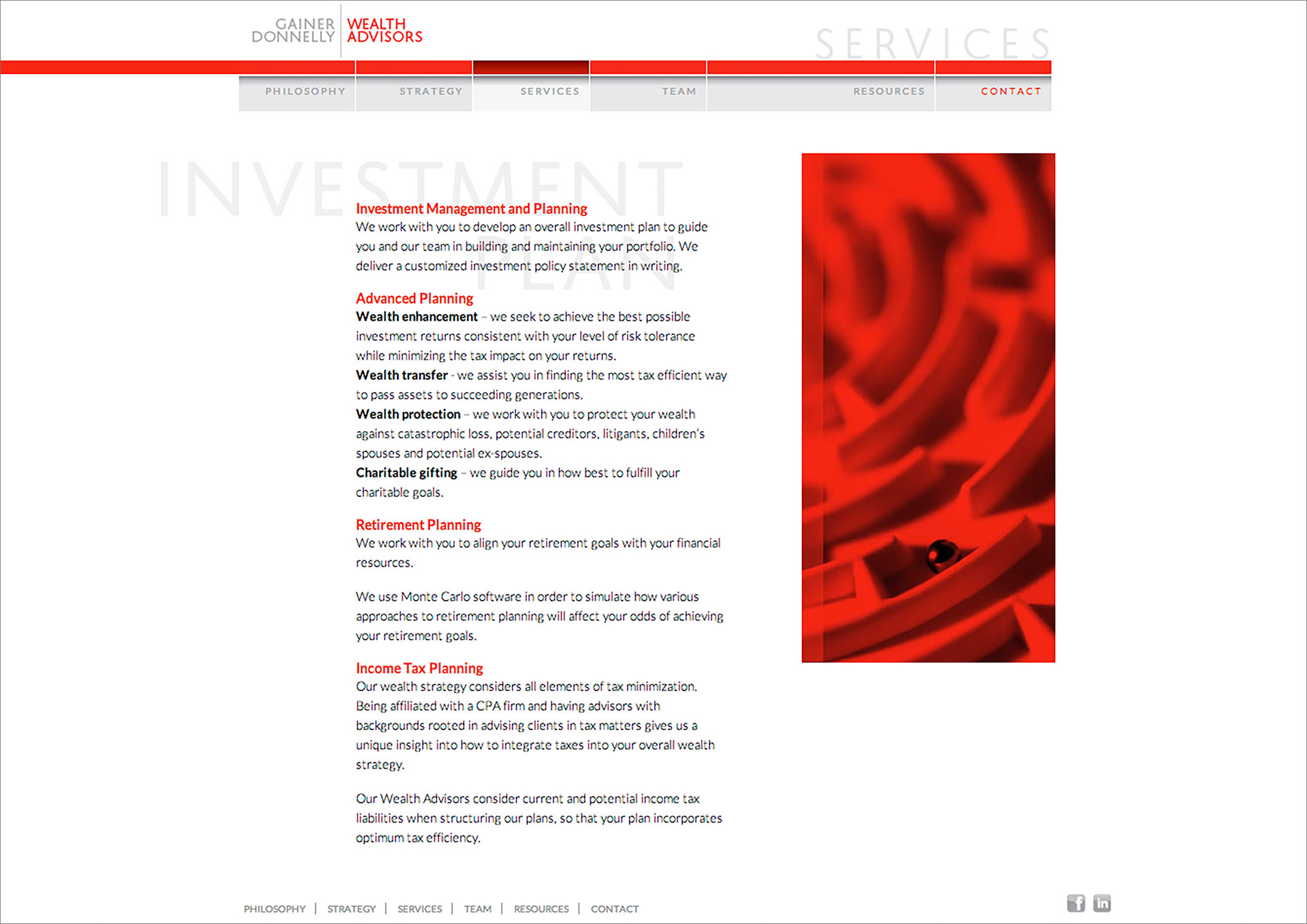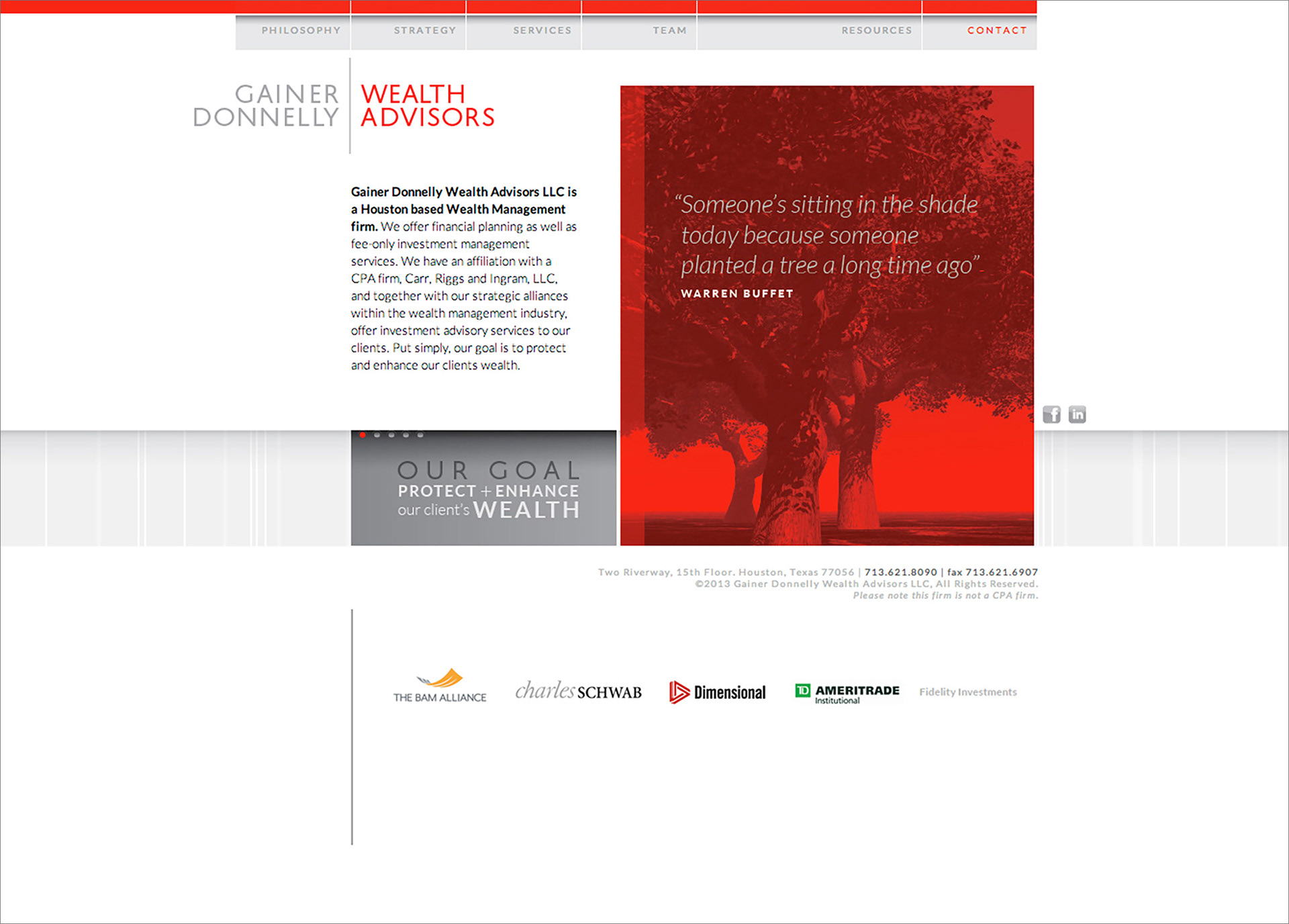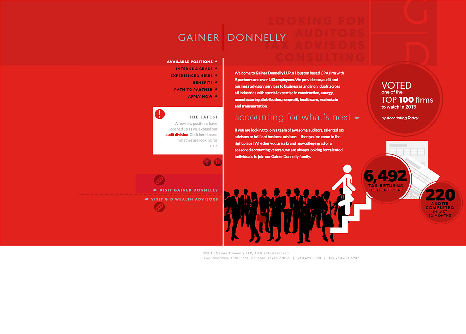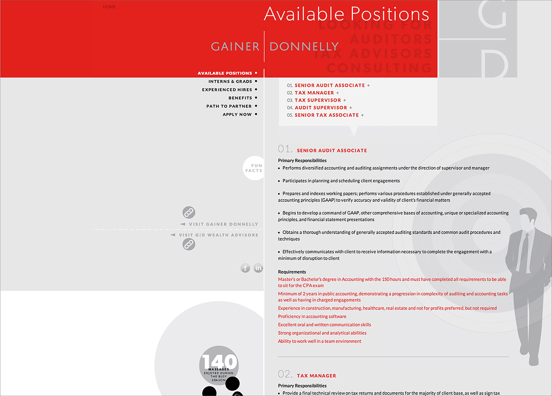 Good Project tackled the rebranding for the large independent CPA firm. Newly named Gainer + Donnelly needed an update to market the new chapter in their evolution. A new logo and brand identity was first created. Good Project handled every aspect of a rebrand that included a stationery system, printed collateral, web site, new lobby design and graphic murals, special event promotions and an annual award winning calendar that was the hallmark in their client marketing