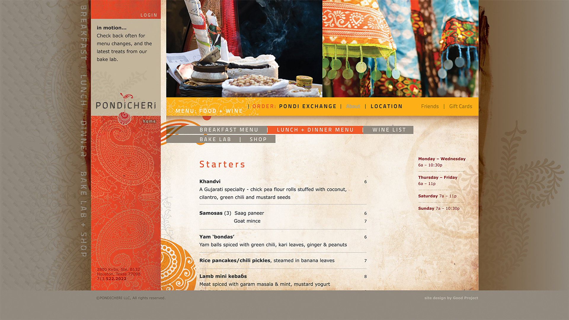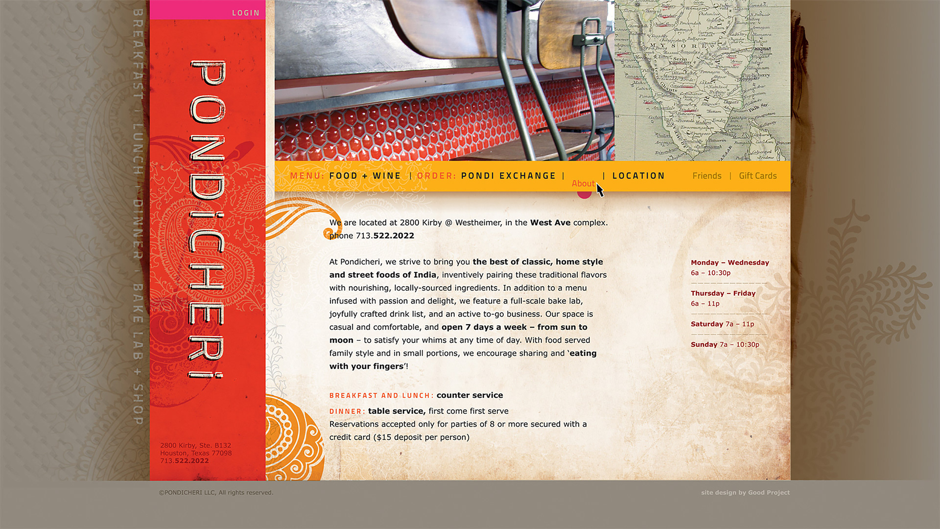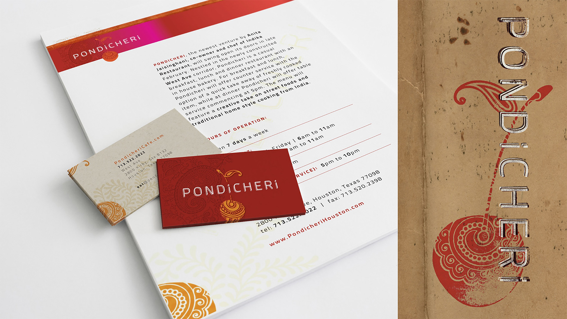 While nationally-recognized owner/chef Anita Jaisinghani looked to expand her fine dining restaurant into a new all day cafe concept, Good Project was tasked with developing the brand identity and visual style of Pondicheri. The popular restaurant in West Ave is ranked #7 in the Top 100 Best Restaurants in Houston list by Houston Chronicle’s food critic, Alison Cook. Beginning with design the logo and brand visuals, Good Project created the visual language by reinterpreting the rich patterns that inspired Anita from her Indian cultural heritage. Texture, patterns, color and typography set the foundation for creating the dynamic brand – from signage, to menu design, packaging, ads and web site. The distinctive brand continues to evolve as they expand to their second location in New York City.